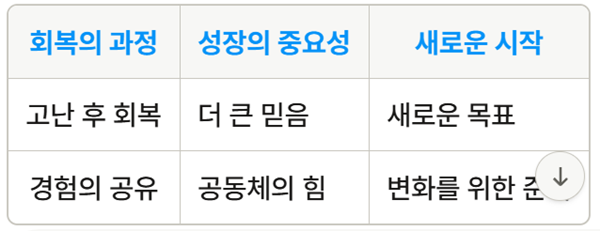 고난을 극복하는 과정에서 기도, 믿음, 감사의 마음을 잊지 말고, 서로를 격려하며 나아가길 바랍니다. 하나님께서 주신 은혜를 통해 우리는 반드시 회복되고, 더 나은 모습으로 나아갈 수 있습니다.