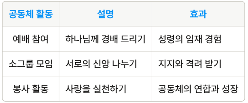 신앙 공동체는 성령의 권능을 경험하는 데 중요한 역할을 합니다. 예배에 참여함으로써 우리는 성령의 임재를 느끼고, 소그룹 모임에서 서로의 신앙을 나누며 격려를 받을 수 있습니다.