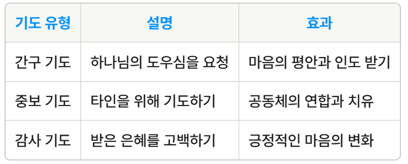 특히 간구 기도를 통해 하나님께서 우리의 필요를 채워 주심을 경험하고, 중보 기도를 통해 공동체의 필요가 충족되는 과정을 목격할 수 있습니다. 감사 기도는 우리의 마음을 긍정적으로 변화시키고, 성령의 역사에 대한 감사를 표현하는 방법입니다.