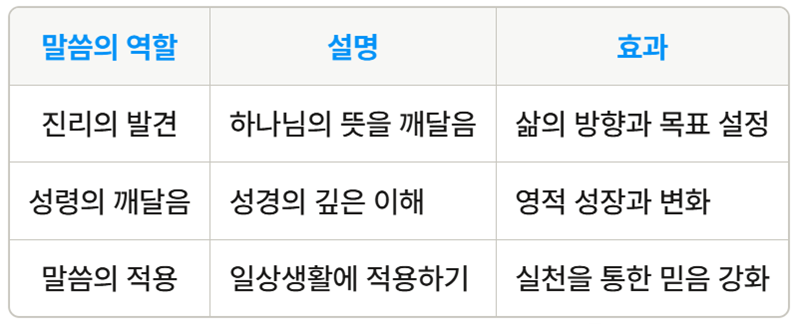 성령은 말씀을 통해 우리에게 진리를 드러내고, 영적 성장을 이끌어 주십니다. 따라서 성경을 읽고 묵상하는 과정은 성령의 권능을 체험하는 데 필수적입니다.