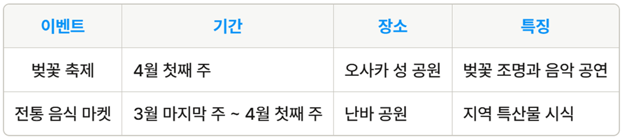 오사카에서는 벚꽃을 주제로 한 다양한 축제와 이벤트가 열리며, 지역 특산물을 맛볼 수 있는 기회도 많습니다. 이런 경험들은 여행의 기억을 더욱 특별하게 만들어 줍니다.