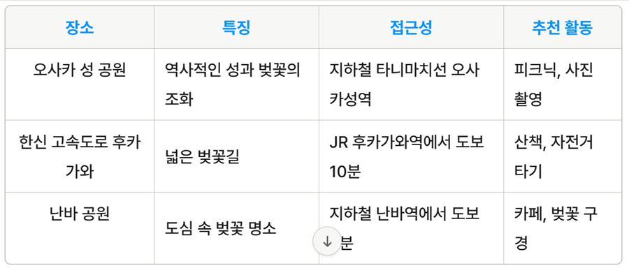 오사카에는 유명한 벚꽃 명소들이 많이 있습니다. 그 중에서도 오사카 성 공원, 한신 고속도로 후카가와, 그리고 난바 공원은 특히 많은 사람들에게 알려져 있습니다. 이들 장소는 벚꽃을 즐기기에 최적의 장소로 손꼽히며, 매년 많은 인파가 몰립니다.