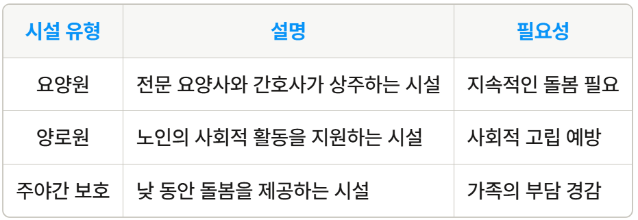 시설급여 역시 장단점이 있습니다. 노인의 상태와 필요에 따라 적절한 선택이 필요합니다.