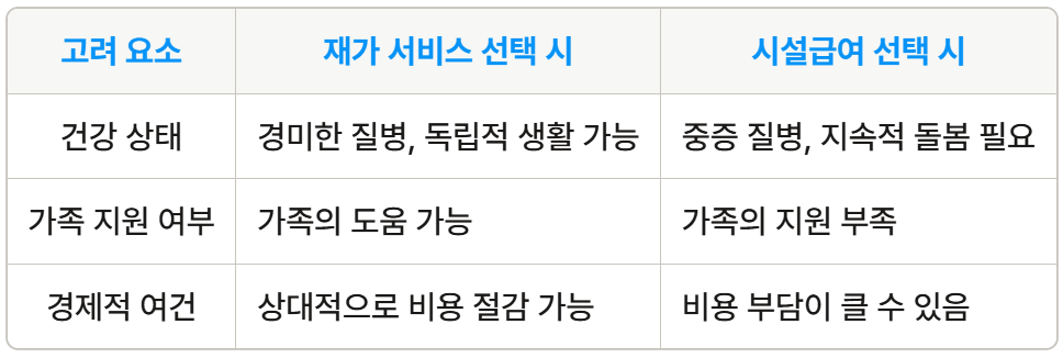 재가 서비스와 시설급여 중 어떤 선택이 나에게 더 적합할지 고민하는 것은 매우 중요합니다. 이를 위해서는 자신의 건강 상태, 가족 상황, 경제적 여건 등을 고려해야 합니다.