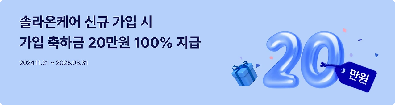 - 솔라온케어 가입 신청 시, 가입 축하금 20만 원이 지급됩니다.