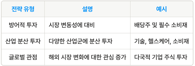 관세 인상으로 인한 시장 변동성을 고려할 때, 투자자들은 보다 신중한 접근이 필요합니다. 특정 산업군에 대한 투자 비중을 조정하거나, 방어적인 주식에 대한 비중을 높이는 전략이 유효할 수 있습니다.