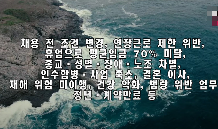 - 근로조건 관련: 임금 체불, 최저임금 미달, 법정 근로시간을 초과하는 근로 등