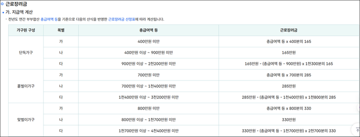 | 맞벌이 가구 | 배우자의 총급여액 등이 3백만원 이상 가구 | 신청인과 배우자 각각의 총급여액이 3밷만원 이상인 가구 |