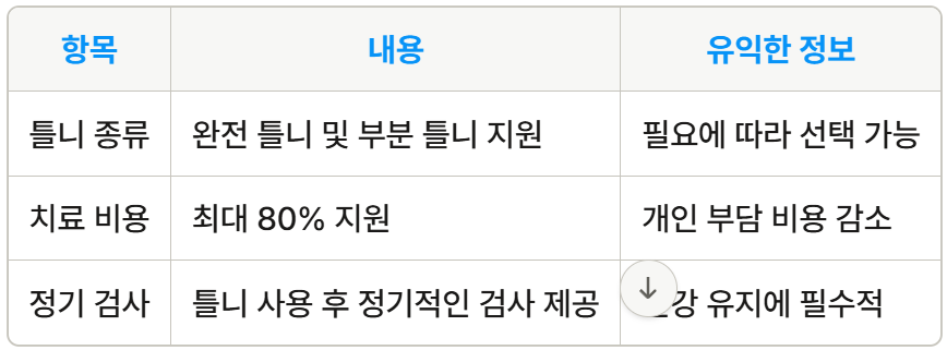 틀니 지원은 완전 틀니와 부분 틀니 모두를 포함하여, 노인들이 필요에 따라 선택할 수 있습니다. 치료 비용의 경우, 최대 80%까지 지원되므로 개인 부담이 크게 줄어듭니다.